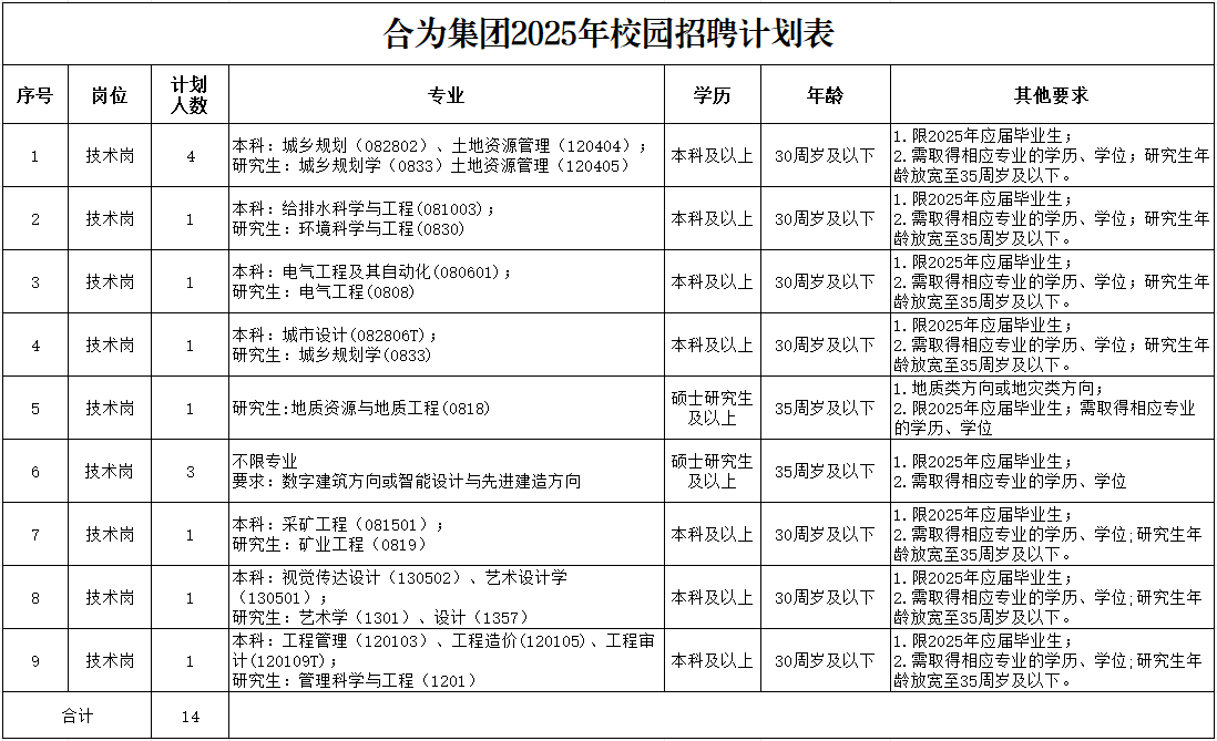 現(xiàn)公開招聘2025應(yīng)屆高校畢業(yè)生14人,具體如下: